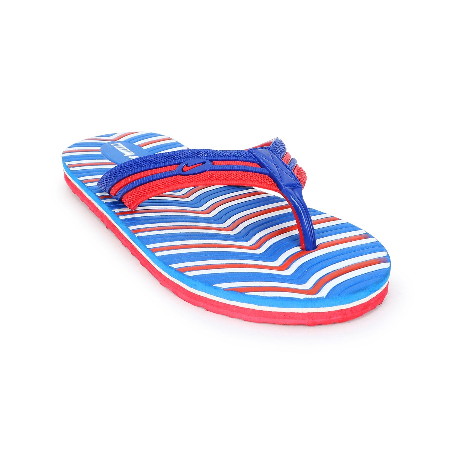 Bring a bold splash of style to your casual days with the Cordmans WaveFlex – Men's Blue & Red Striped Flip-Flops. With a vibrant wave-striped design in electric blue, fiery red, and crisp white, these flip-flops are made for those who like their comfort with a side of statement.